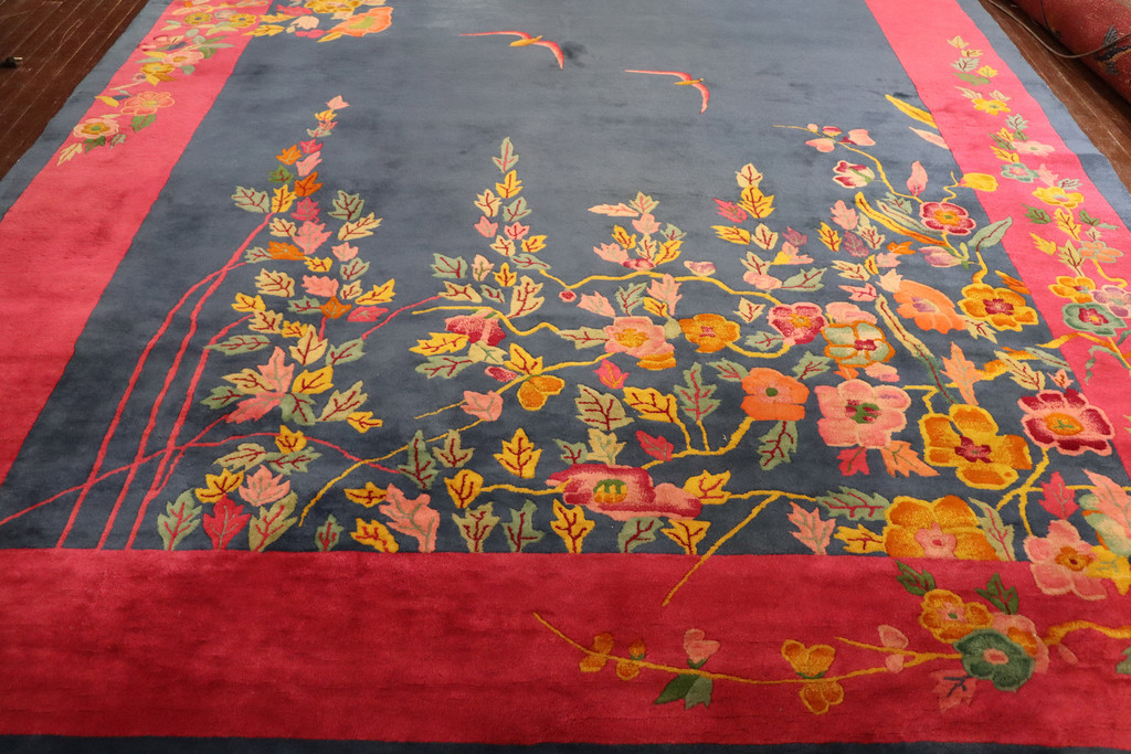 This wonderful Art Deco carpet was made in China, circa 1910s or 1920s. It has purchased from a nice home in New York. Walter Nichols was great American rug producer (the Art Deco rugs which he did not originate them) in Tientsin. The rugs made of wool and silk with bold vibrant colors and the pattern are pictorial scenes and trees, birds, clouds, mountains, dragons, butterfly and flowers. The production of Art Deco rugs started from 1910s-1950s and mostly with western influence.