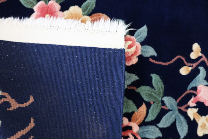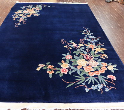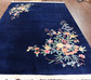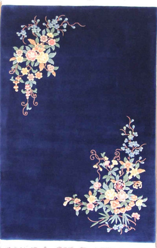 Antique handmade Art Deco Chinese carpet, perfect natural dyed Blue background color. c-1940, traditionally floral Design on two corners, rectangular shape. In excellent condition. Most wonderful Art Deco carpet was made in China, starting from circa 1910's or 1920's and up. Walter Nichols was great American rug producer (the Art Deco rugs which he did not originate them) in Tientsin. The rugs made of wool and silk with bold vibrant colors and the pattern are pictorial scenes and trees, birds, clouds, mountains, dragons, butterfly and flowers. The production of Art Deco rugs started from 1910's-1950's and mostly with western influence.