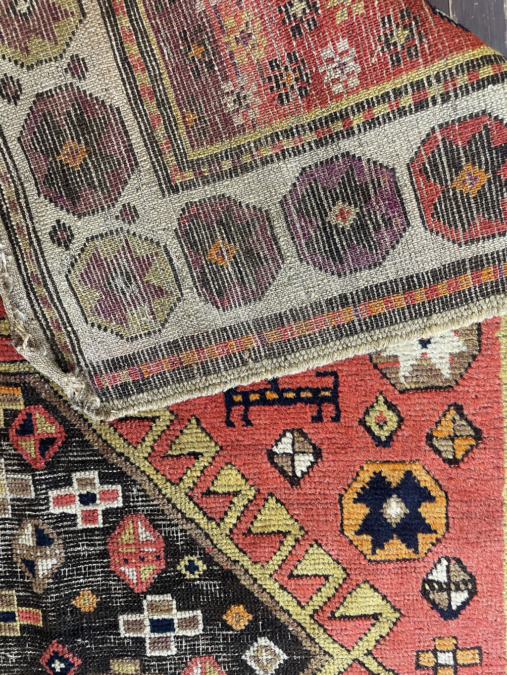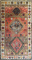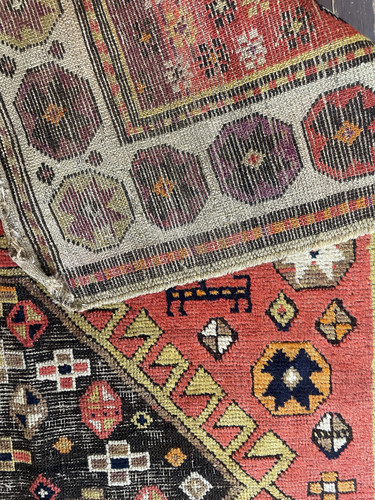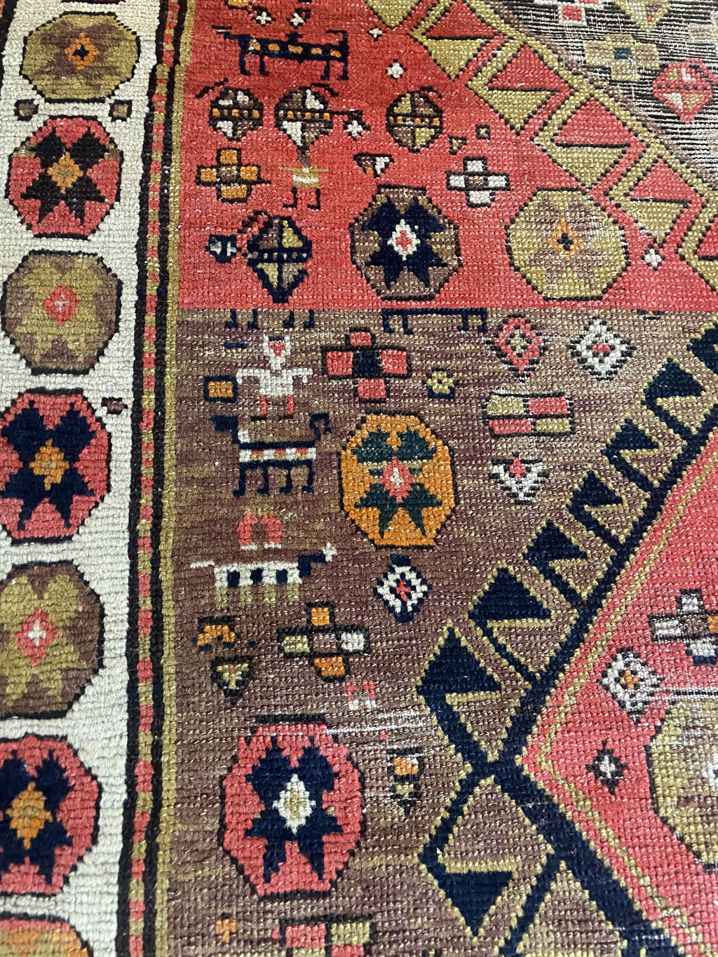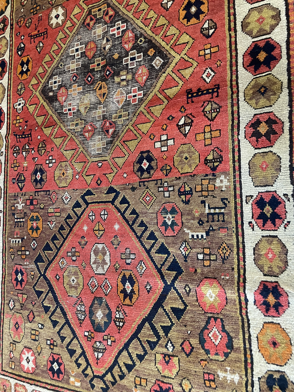 Antique Caucasian Kazak Rug Size: 4'1" x 7' Origin: Southwest Caucasus Date: Late 19th Century Construction: Hand-knotted Goat wool on wool foundation. This late 19th-century Caucasian Kazak rug presents a compelling and highly individual interpretation of classic tribal design, distinguished by its intentional asymmetry, expressive drawing, and richly aged palette. The field is anchored by a sequence of large geometric medallions, each uniquely rendered and enclosed within bold, serrated outlines. Rather than strict repetition, the composition unfolds organically, reflecting the spontaneity of village weaving. Surrounding these central forms is a lively array of symbolic tribal motifs, including stylized human and animal figures, small crosses, rosettes, and protective devices—elements that lend the rug a narrative, almost pictographic quality. The color palette is one of the rug’s most engaging attributes, combining warmth, depth, and visible age: A dominant burnt orange to soft red field, rich yet mellowed over time Expanses of camel and warm khaki tones, softened from their original deeper brown and aubergine hues, now carrying a beautiful patina A wide ivory border, creating strong contrast and framing the composition with clarity Accents of golden yellow, deep black, and touches of navy, adding definition and graphic strength Natural abrash and subtle tonal variation are present throughout, enhancing the rug’s authenticity and visual movement. The contrast between the aged camel tones on the face and the deeper undertones visible in the foundation speaks to the use of natural dyes and genuine age. Overall: Good antique condition Structurally sound with even wear consistent with age Noticeable corrosion in the brown areas, typical of 19th-century Caucasian rugs due to the nature of the dyes Colors remain attractive, with a soft, time-earned patina This is an honest, unaltered example, where age is visible and contributes to its character rather than detracting from it. Collector & Decorative Appeal While not a rigid or “formal” Kazak type, this piece stands out for its: Asymmetrical, artistic composition Presence of figural and tribal storytelling elements Warm, decorative palette suited to modern interiors Authentic village weaving with strong personality It occupies a desirable space between collector textile and decorative statement piece, making it versatile in today’s market. Retail Value Estimate Taking into account: Authentic late 19th-century origin Unique design and visual appeal Condition, including brown corrosion Current market demand for decorative Caucasian rugs Estimated Retail Value: $5,500 – $7,500