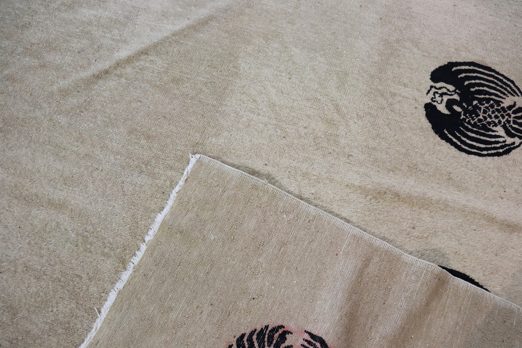 For its age, the carpet remains in very good condition, with well-preserved colors and design clarity that continue to bring presence and charm to any space. Its neutral ivory ground allows the bold black bat border to truly stand out, making it a versatile piece that complements both modern interiors and classic antique décor.