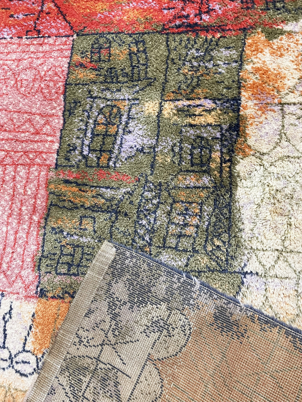 The beautiful colors and artistic details make the carpet rare and authentic carpet. The bright colors range from warm and bright colors to the cooler neutral ones. The way this wide range of shades combines and plays each other helps to show the different encounters and adventures that Klee had along the way.