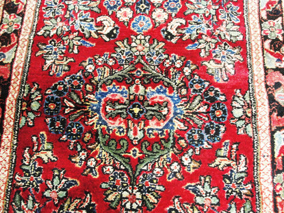 Sarouks also called Sarouks are double-wefted, heavier carpets with a higher knot count than rug from the village of Sultanabad. Fields are often blue or ivory and designs typically feature either large medallions or representations of trees and birds. Measures: 2'7" x 10'6".