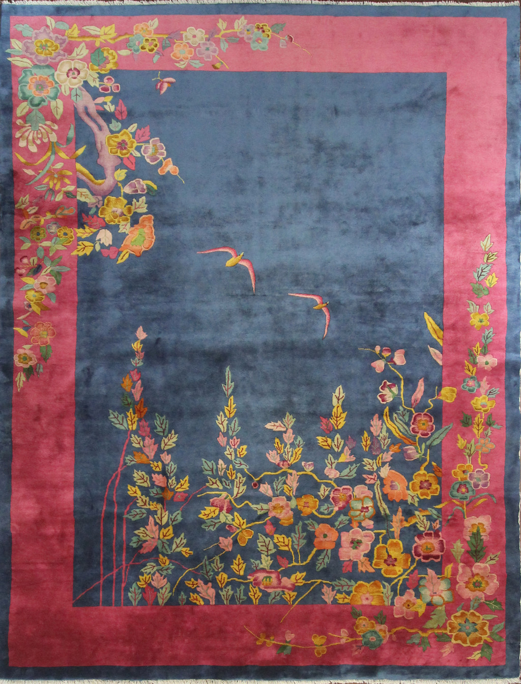 This wonderful Art Deco carpet was made in China, circa 1910s or 1920s. It has purchased from a nice home in New York. Walter Nichols was great American rug producer (the Art Deco rugs which he did not originate them) in Tientsin. The rugs made of wool and silk with bold vibrant colors and the pattern are pictorial scenes and trees, birds, clouds, mountains, dragons, butterfly and flowers. The production of Art Deco rugs started from 1910s-1950s and mostly with western influence.