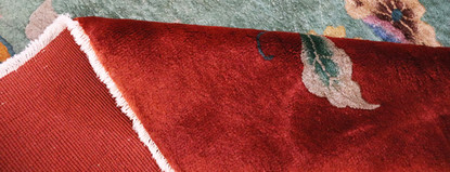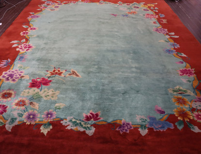 This wonderful Art Deco carpet was made in China, circa 1920s or 1910s. It has purchased from a nice home in New York. Walter Nichols was great American rug producer (the Art Deco rugs which he did not originate them) in Tientsin. The rugs made of wool and silk with bold vibrant colors and the pattern are pictorial scenes and trees, birds, clouds, mountains, dragons, butterfly and flowers. The production of Art Deco rugs started from 1910s-1950s and mostly with western influence.