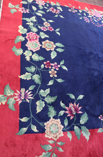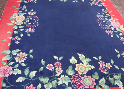 An amazing Art Deco Chinese carpet, 7'9" x 9'7", c-1920's. This beautiful rich colors is in perfect condition, the ends and sides are secured and full high natural dyed wool throughout the carpet. Amazing rich blue and red background color with floral traditional design of multi colors.