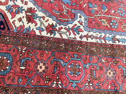 A great painting is measure by beauty of its colors and the same statement goes for this rug. Heriz rugs are Persian rugs from the area of Heriz, East Azerbaijan in northwest Iran, northeast of Tabriz. Such rugs are produced in the village of the same name in the slopes of Mount Sabalan. Heriz carpets are durable and hard-wearing and they can last for generations. 19th century examples of such carpets are often found on sale by major auction houses in United States and Europe.