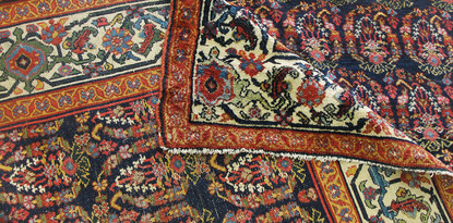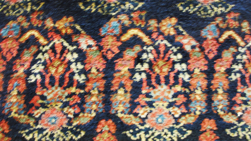 The tribal weavers in Malayer were often Turkish, and they employed the Turkish knot. The Gourde is a symmetrical knot, as opposed to the asymmetrical knot of many traditionally Persian creations. Additionally, antique Malayer rugs regularly enjoy a low cut pile. Weavers trimmed the pile in order to enhance the appearance of the design. In addition to a broad range of design and color, these rugs were designed technically to enhance the artistry of the woven design. Local weavers produced a spectacular array of traditional patterns ranging from dense all-over motifs to lozenge-shaped medallions that are placed over chic monochromatic grounds. Although angular motifs are favored, some of the finer Herati patterns feature subtle curvilinear details. One of the charming constants of antique Malayer rugs is the importance placed on creating richly detailed borders that rival the spectacular patterns featured within the field. Weavers in Malayer consistently put great effort into creating exquisite border. Herati-pattern has its name from the city of Herat in Northwestern Afghanistan. It is a common pattern found mainly on handmade carpets from Iran. It comprises of a flower inside a rhomb surrounded by four acanthus-leaves. These leafs are sometimes called fishes, because of its similarity, and the pattern is often used on carpets with an all-over/repeated motif.