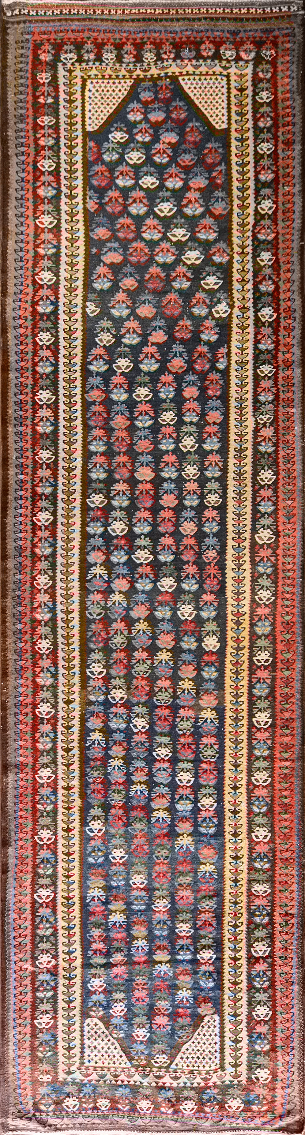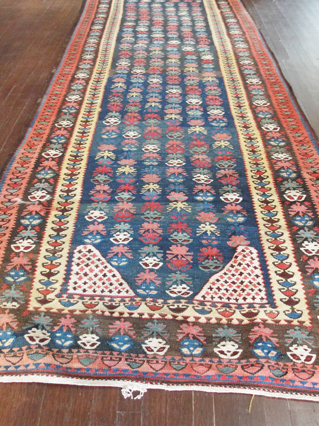 The technique involves wrapping colored weft threads over and under the warp threads, adding strength and embroidery-like pattern. Measures: 4'2" x 15'8".