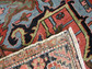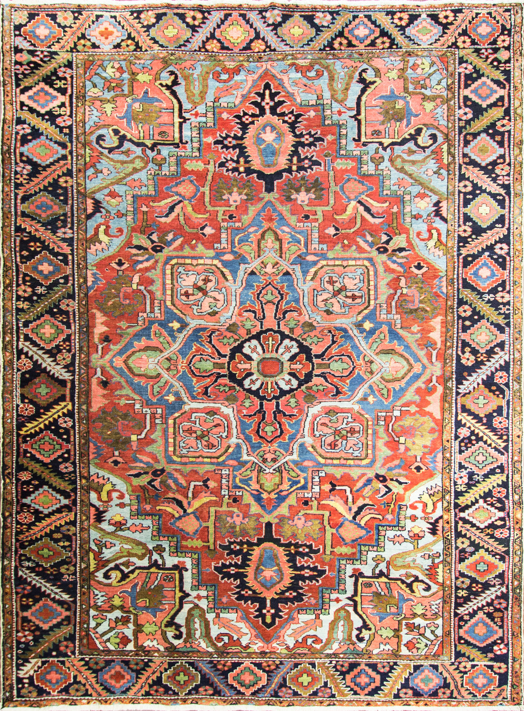 This Heriz carpet has distinct color combination and bold geometric designs. Heriz rugs are Persian rugs from the area of Heris, East Azerbaijan in northwest Iran, northeast of Tabriz. Such rugs are produced in the village of the same name in the slopes of Mount Sabalan. Heriz carpets are durable and hard-wearing and they can last for generations. 19th century examples of such carpets are often found on sale by major auction houses in United States and Europe.