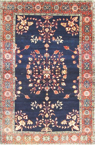 Feraghans were made between the 1870s-1913 from a region north of the town of Arak, produced for the Persian aristocracy. They are single wefted, long and narrow or room-sized carpets, typically with an all-over herati design or floral and curling leaf motifs. Feraghan-Sarouks, also called Sarouks, are double-wefted, heavier carpets with a higher knot count than village Sultanabad. Fields are often blue or ivory and designs typically feature either large medallions or representations of trees and birds.