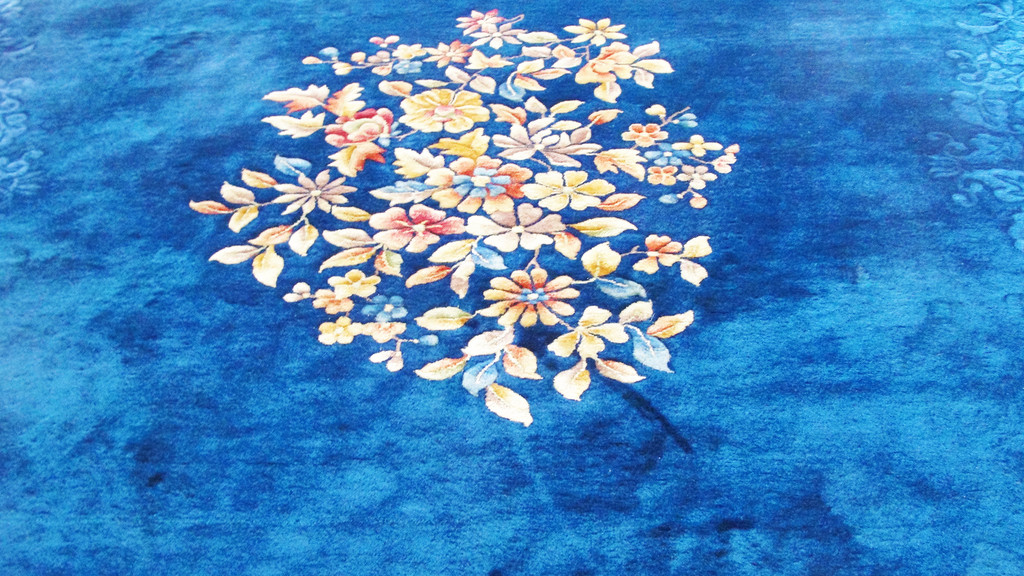 This wonderful Art Deco carpet was made in China, circa 1910s or 1920s. It has purchased from a nice home from Washington. Walter Nichols was great American rug producer (the Art Deco rugs which he did not originate them) in Tientsin. The rugs made of wool and silk with bold vibrant colors and the pattern are pictorial scenes and trees, birds, clouds, mountains, dragons, butterfly and flowers. The production of Art Deco rugs started from 1910s-1950s and mostly with western influence.