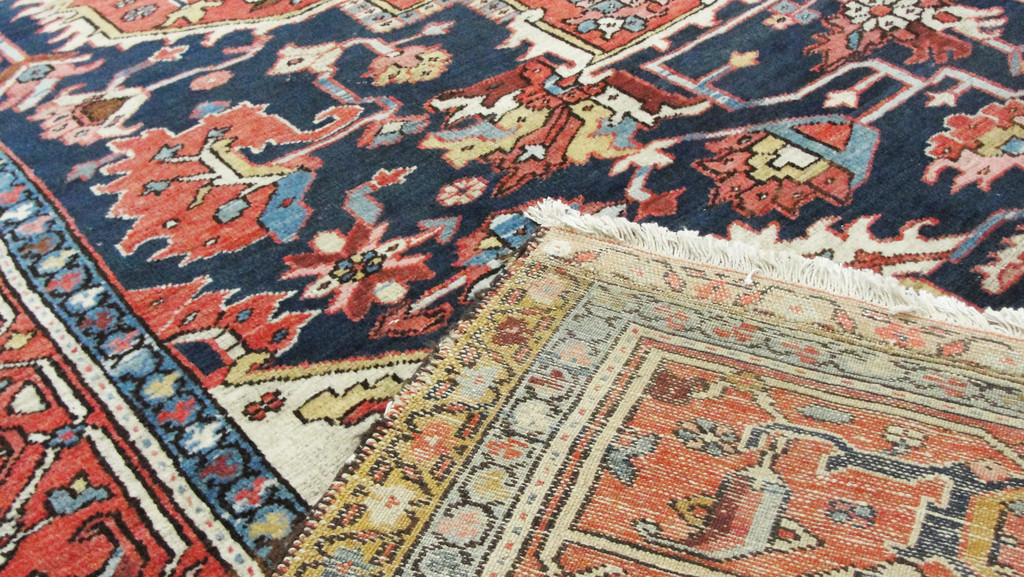 Fine 19th-century antique Serapi carpet of Persia. Woven in the rugged mountains of Northwest Persia, Serapi rugs are a distinct Heriz region style, with finer knotting and more large-scale spaciously placed antique carpet designs than other rugs from this area. Persian carpets had to be taken by their weavers to Serab, 30 miles distant, to be marketed. “Serapi” is not a place or tribal name; rather it is a market term derived from “Serab-i,” meaning “of Serab”. The bold geometric designs are probably connected to the tribal Caucasian traditions across the Aras River to the north. The weaving was done almost exclusively by women. Highly skilled artisans, they continually reinterpreted the design as they wove, the antique Serapi rugs made in small workshops .