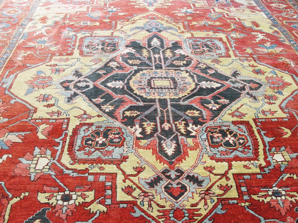 This remarkable and artistic antique rug, showcases an ornate, multicolored central design. At the heart of the antique Persian Heriz Serapi rug, a many-petaled flower is surrounded by a twelve-pointed stellar shape in light and dark blue and yellow. Angular stylized flowers stud the navy form and are echoed across the red medallion that encases it. Four ornaments decorate the corners of the medallion, and floral adornments nestle within each tip. A rust red field, brimming with botanical decorations, extends the medallion’s shape. Intricate patterning fills each corner of this breathtaking antique rug with blue green over pale red. White bands filled with tiny blooms edge the red border, which contains its own blossoming decorations elaborated with blue green and white curls.