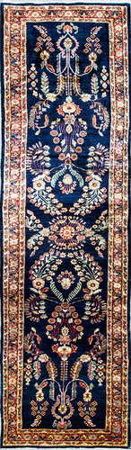 The blue field woven with flowering fan palmettes extending to a central floral spray and flower-filled urns within rust flowering palmette and vine border by blue and ivory guard borders. The source of this important provenance has been in the village of Sarouk. North of Arak (formerly Sultanabad). Sarouks are known to be of high quality. The pile is usually higher than the average Persian rug and therefore Sarouks are rather heavy and solid rugs, the wool being used is high quality durable wool. "Mohajeran" or "Mahajeran" is the name of a village West of Arak. About 80-100 years ago American companies ordered relatively fine Mahal rugs with higher pile Western influenced designs which today are also called "Sarouk Mohajeran", "Sultanabad" or "Sarouk Mahal".