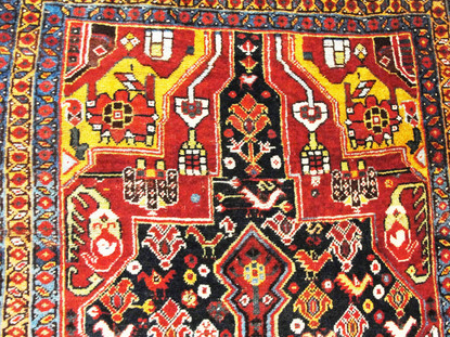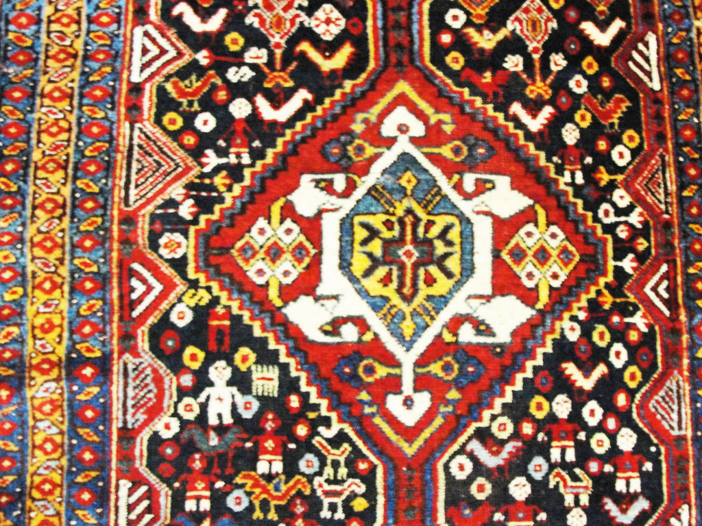 The Qashgai nomads are found in the Fars province in the southwest of Iran. They move twice a year, between the winter pasture near the Persian Gulf and the summer pasture up in the Zagros mountains where it is much cooler. The carpets have a typical red-brown ground color. The pattern is tied from memory and often consists of a centrally placed medallion, repeated in all four corners. Humans, four legged animals, birds, trees and flowers are popular elements. Qashgai carpets consist of a hexagon or diamond with four projecting hooks inside of a hooked diamond. Some Qashgai pieces have the Hebatlu design (Hebatlu is the name of one of the one of the smaller Qashgai tribes) and it consists of circular central medallion, and smaller designs similar to the central medallion repeated on each of the four corners of the carpet. Technical specifications: Pile: Wool yarn. Weft: Wool or goat hair yarn, usually two wefts after each row of knots. Warp: Wool or goat hair yarn. Knot: Symmetrical. Measures: 3' x 12'.