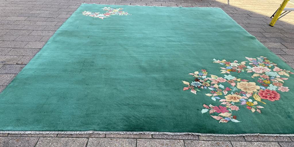 The rug's enchanting design unfolds with a serene green background and a captivating floral pattern that comes alive with intricate details. Stylized flowers engage in delightful conversation, showcasing the creativity synonymous with the Art Deco movement.